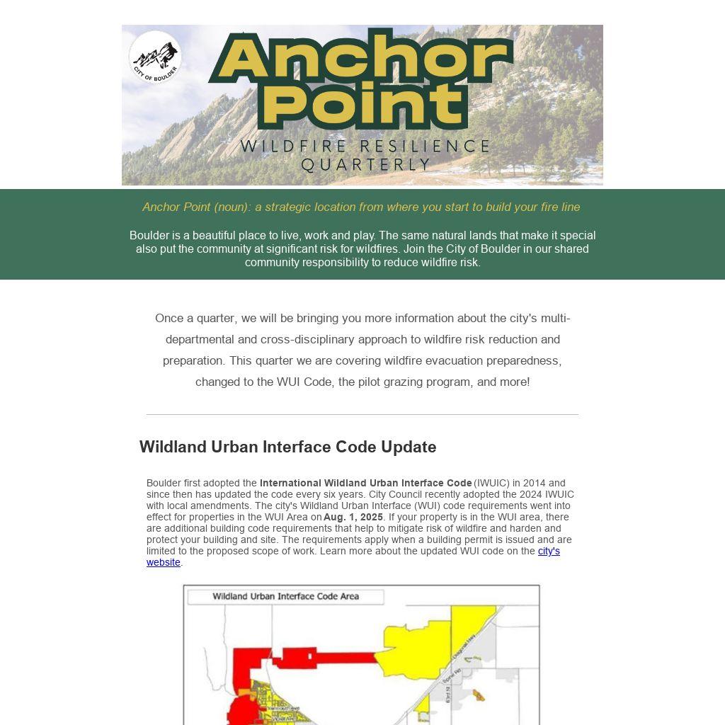 Boulder first adopted the International Wildland Urban Interface Code (IWUIC) in 2014 and since then has updated the code every six years. City Council recently adopted the 2024 IWUIC with local amendments. The city's Wildland Urban Interface (WUI) code requirements went into effect for properties in the WUI Area on Aug. 1, 2025. If your property is in the WUI area, there are additional building code requirements that help to mitigate risk of wildfire and harden and protect your building and site. The requirements apply when a building permit is issued and are limited to the proposed scope of work. Learn more about the updated WUI code on the city's website.