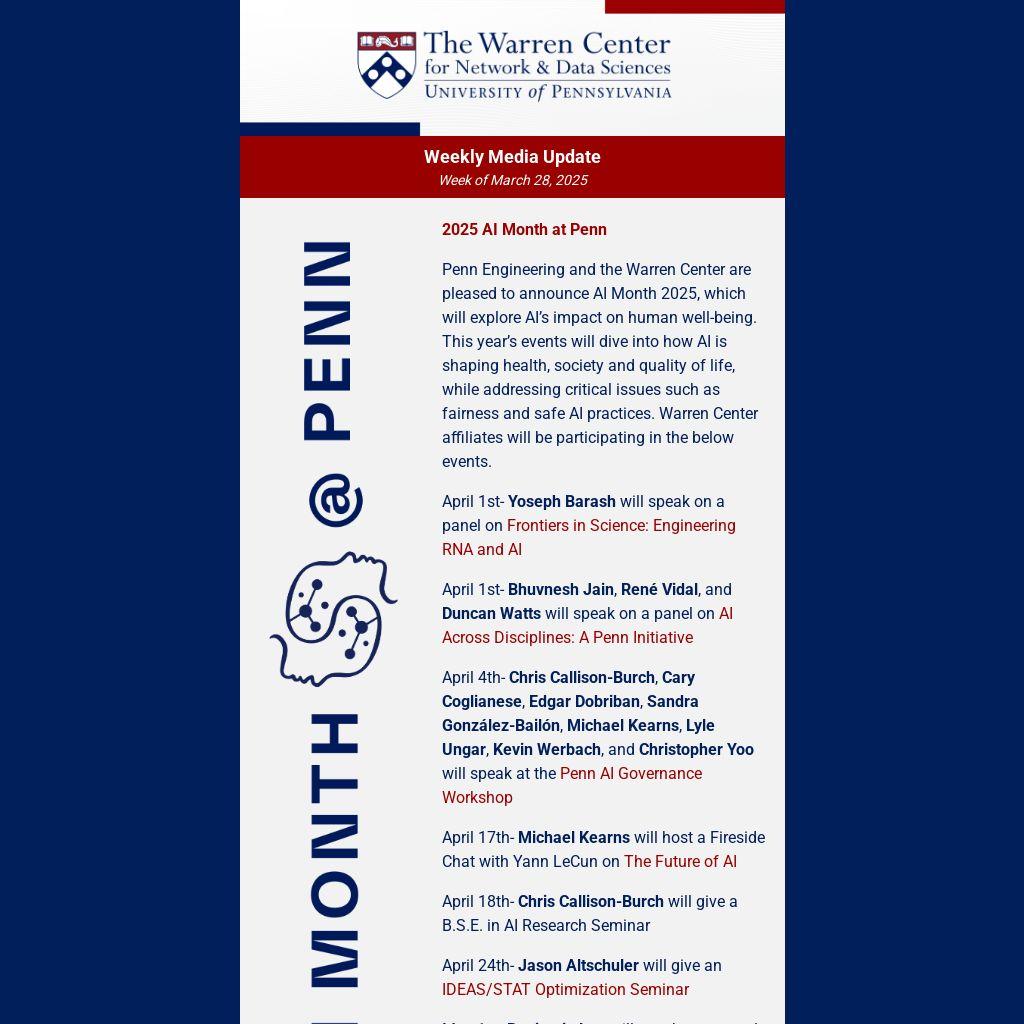 Penn Engineering and the Warren Center are pleased to announce AI Month 2025, which will explore AI’s impact on human well-being. This year’s events will dive into how AI is shaping health, society and quality of life, while addressing critical issues such as fairness and safe AI practices. Warren Center affiliates will be participating in the below events.