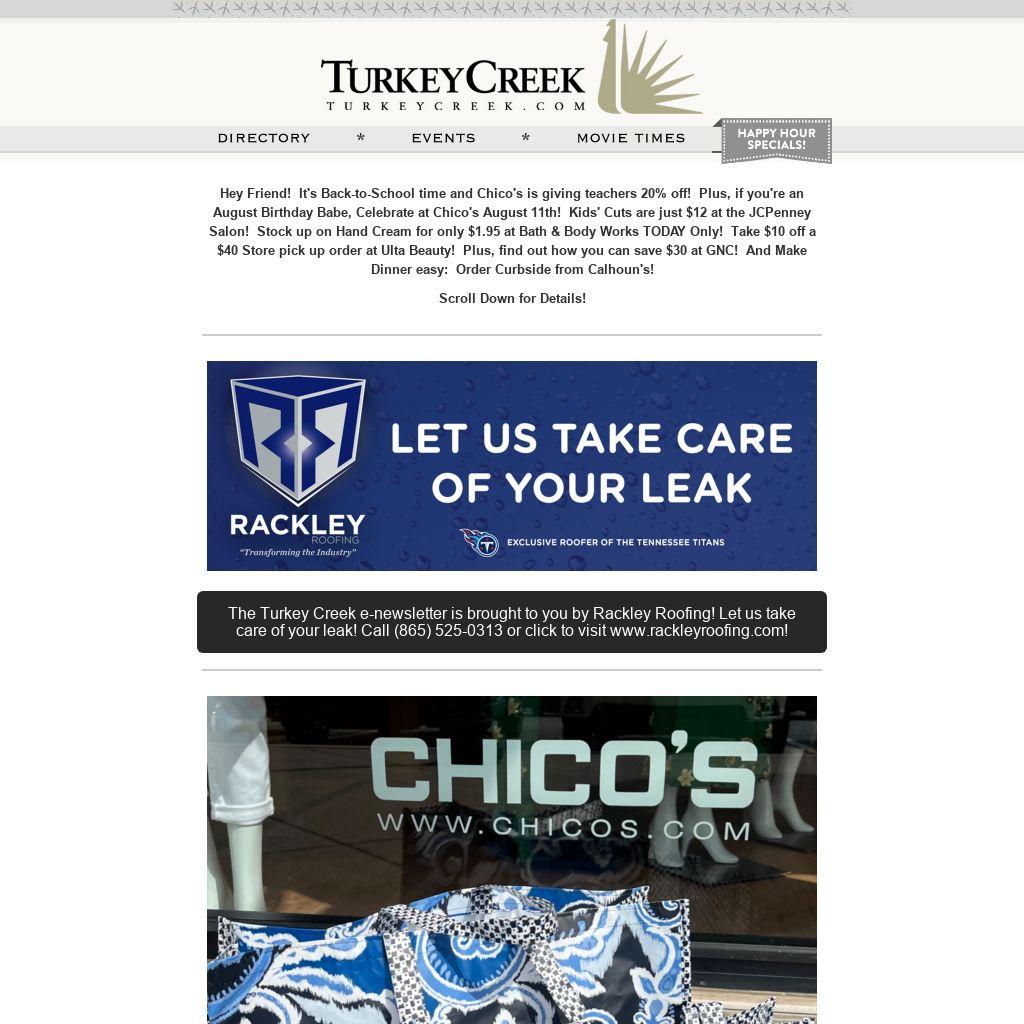 Hey Friend! It's Back-to-School time and Chico's is giving teachers 20% off! Plus, if you're an August Birthday Babe, Celebrate at Chico's August 11th! Kids' Cuts are just $12 at the JCPenney Salon! Stock up on Hand Cream for only $1.95 at Bath & Body Works TODAY Only! Take $10 off a $40 Store pick up order at Ulta Beauty! Plus, find out how you can save $30 at GNC! And Make Dinner easy: Order Curbside from Calhoun's!