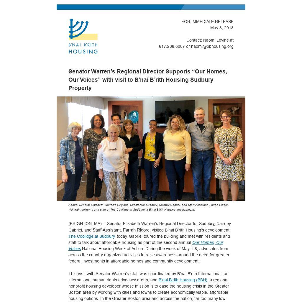(BRIGHTON, MA) -- Senator Elizabeth Warren’s Regional Director for Sudbury, Nairoby Gabriel, and Staff Assistant, Farrah Ridore, visited B’nai B’rith Housing’s development, The Coolidge at Sudbury, today. Gabriel toured the building and met with residents and staff to talk about affordable housing as part of the second annual Our Homes, Our Voices National Housing Week of Action. During the week of May 1-8, advocates from across the country organized activities to raise awareness around the need for greater federal investments in affordable homes and community development.