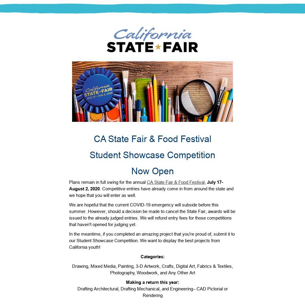 Accepted entries will be on display for the duration of the CA State Fair & Food Festival, July 17th - August 2nd. Open to all California residents, ages 5-18.