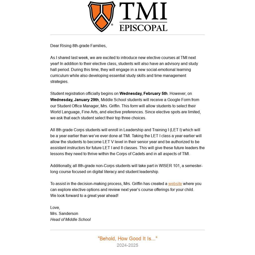 As I shared last week, we are excited to introduce new elective courses at TMI next year! In addition to their elective class, students will also have an advisory and study hall period. During this time, they will engage in a new social-emotional learning curriculum while also developing essential study skills and time management strategies.