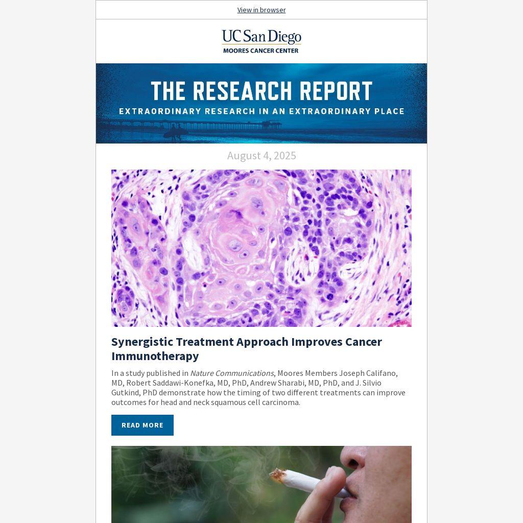 In a study published in Nature Communications, Moores Members Joseph Califano, MD, Robert Saddawi-Konefka, MD, PhD, Andrew Sharabi, MD, PhD, and J. Silvio Gutkind, PhD demonstrate how the timing of two different treatments can improve outcomes for head and neck squamous cell carcinoma.