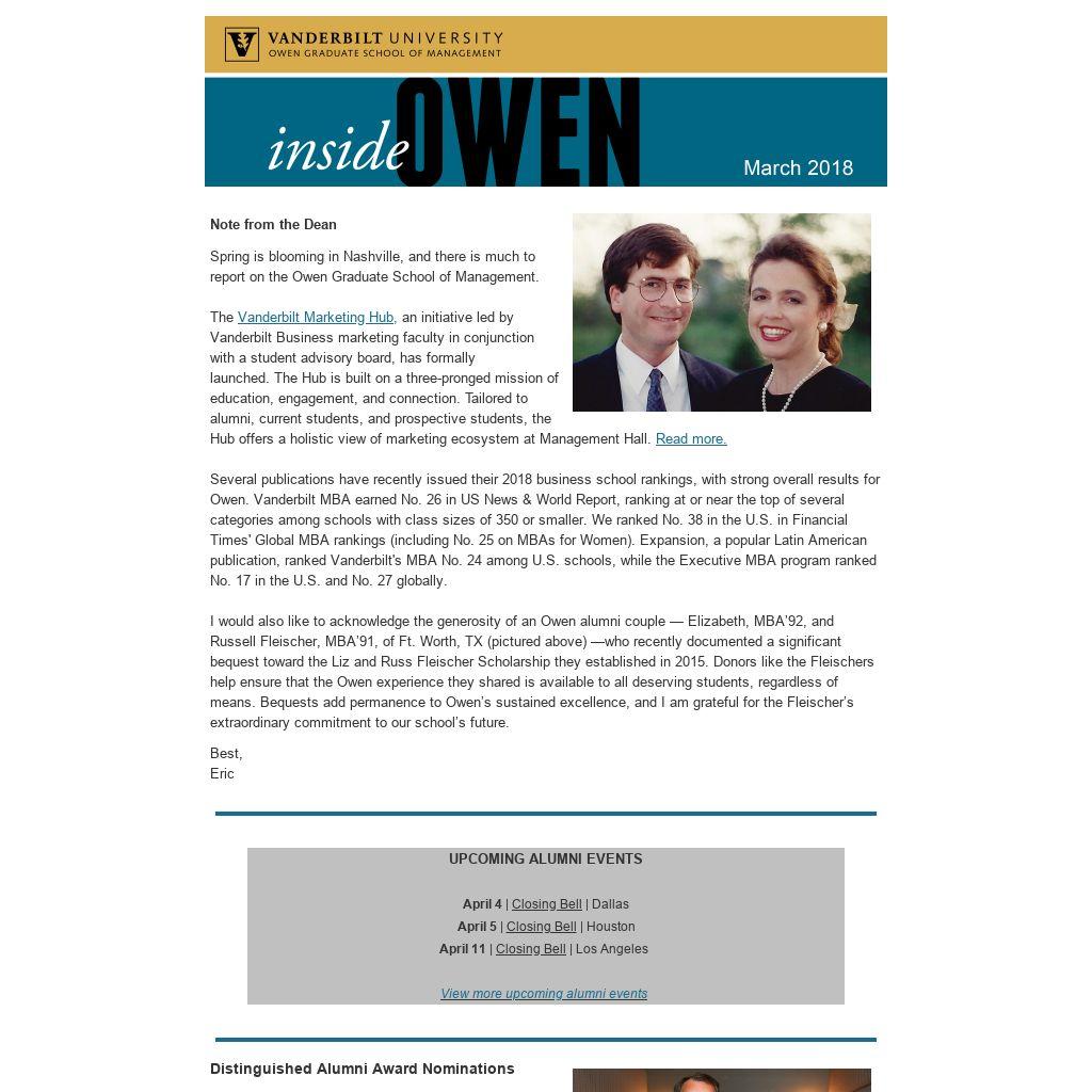 | Distinguished Alumni Award Nominations Do you know of an alumnus making an impact in the world? The Vanderbilt Owen Graduate School of Management Distinguished Alumni Award recognizes one graduate who has exhibited outstanding leadership and service in both the professional and philanthropic realms. The recipient will have also contributed significantly to Owen by donating time, energy, talent or financial support and will have built networks through class activities, regional programs such as CityOwen, board involvement, and service to current students and faculty. Complete this form and nominate an alumnus today! The Deadline is Friday, April 20. Contact Jill Dunham (jill.dunham@owen.vanderbilt.edu) with any questions.