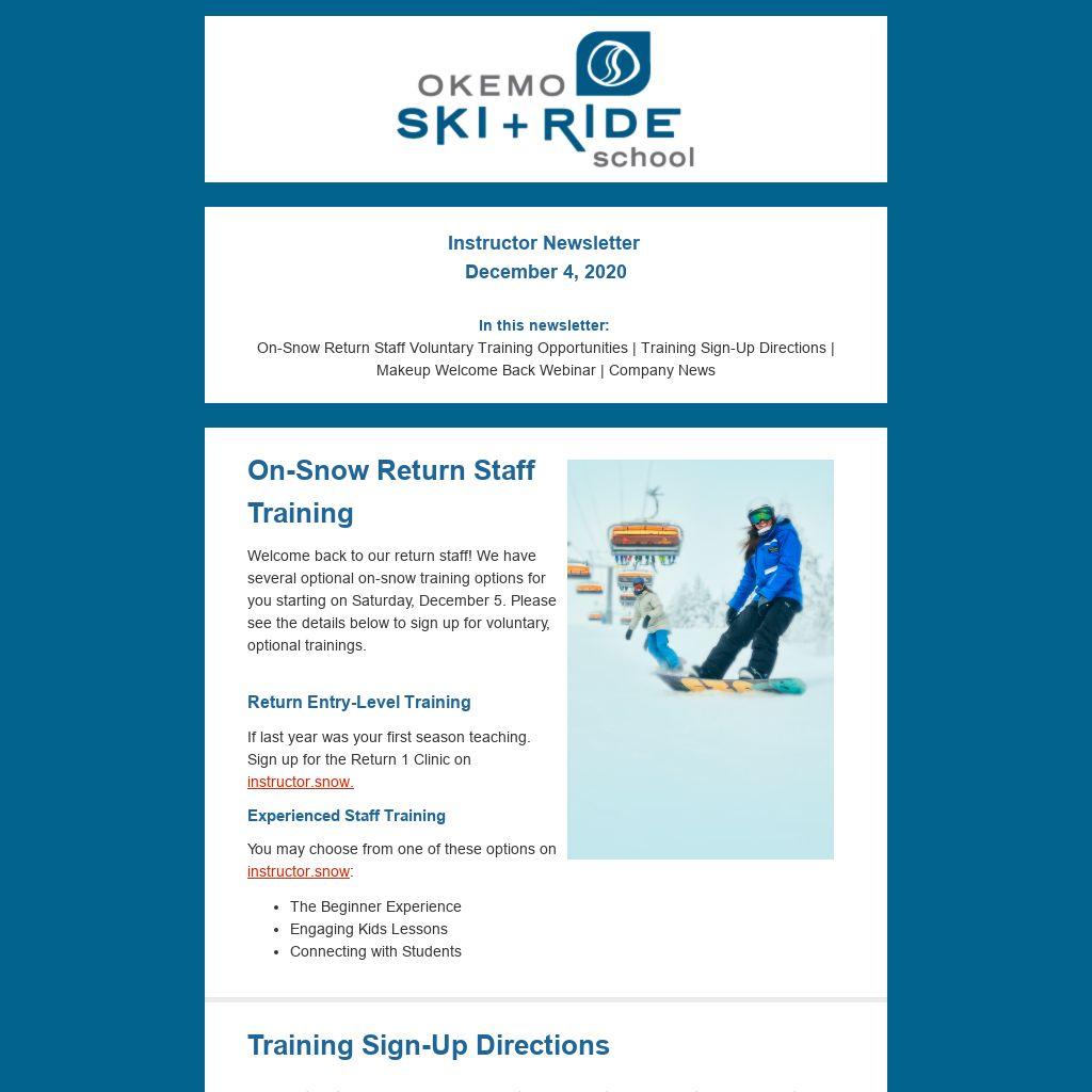 Welcome back to our return staff! We have several optional on-snow training options for you starting on Saturday, December 5. Please see the details below to sign up for voluntary, optional trainings.