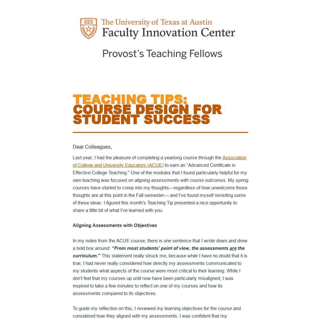 If you want to keep thinking about these ideas, join us on Thursday, November 18th (TODAY!) at 11:00am on Zoom for our next Provost’s Teaching Fellows Think Tank. In this session, Dr. Heidi Toprac from the McCombs School of Business and Dr. Kristin Patterson from the Texas Institute for Discovery Education in Science will lead a discussion on course alignment. RSVP to receive the Zoom link.