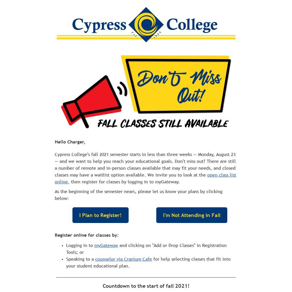 Cypress College's fall 2021 semester starts in less than three weeks — Monday, August 23 — and we want to help you reach your educational goals. Don't miss out! There are still a number of remote and in-person classes available that may fit your needs, and closed classes may have a waitlist option available. We invite you to look at the open class list online, then register for classes by logging in to myGateway.