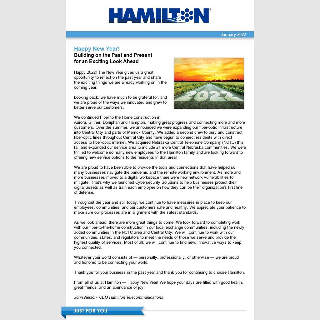 Building on the Past and Presentfor an Exciting Look Ahead Happy 2022! The New Year gives us a great opportunity to reflect on the past year and share the exciting things we are already working on in the coming year. Looking back, we have much to be grateful for, and we are proud of the ways we innovated and grew to better serve our customers. We continued Fiber to the Home construction in Aurora, Giltner, Doniphan and Hampton, making great progress and connecting more and more customers. Over the summer, we announced we were expanding our fiber-optic infrastructure into Central City and parts of Merrick County. We added a second crew to bury and construct fiber-optic lines throughout Central City and have begun to connect residents with direct access to fiber-optic internet. We acquired Nebraska Central Telephone Company (NCTC) this fall and expanded our service area to include 21 more Central Nebraska communities. We were thrilled to welcome so many new employees to the Hamilton family and are looking forward to offering new service options to the residents in that area! We are proud to have been able to provide the tools and connections that have helped so many businesses navigate the pandemic and the remote working environment. As more and more businesses moved to a digital workspace there were new network vulnerabilities to mitigate. That's why we launched Cybersecurity Solutions to help businesses protect their digital assets as well as train each employee on how they can be their organization's first line of defense. Throughout the year and still today, we continue to have measures in place to keep our employees, communities, and our customers safe and healthy. We appreciate your patience to make sure our processes are in alignment with the safest standards. As we look ahead, there are more great things to come! We look forward to completing work with our fiber-to-the-home construction in our local exchange communities, including the newly added communities in the NCTC area and Central City. We will continue to work with our communities, states, and regulators to meet the needs of those we serve and provide the highest quality of services. Most of all, we will continue to find new, innovative ways to keep you connected. Whatever your world consists of — personally, professionally, or otherwise — we are proud and honored to be connecting your world. Thank you for your business in the past year and thank you for continuing to choose Hamilton. From all of us at Hamilton — Happy New Year! We hope your days are filled with good health, great friends, and an abundance of joy. John Nelson, CEO Hamilton Telecommunications |