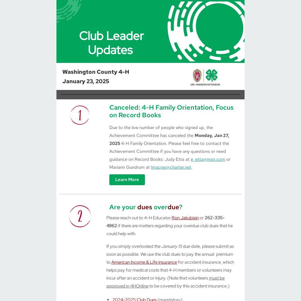 | Please reach out to 4-H Educator Ron Jakubisin or 262-335-4862 if there are matters regarding your overdue club dues that he could help with.