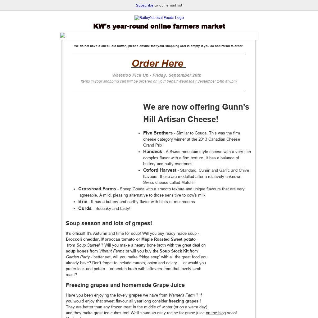 | We do not have a check out button, please ensure that your shopping cart is empty if you do not intend to order. Order Here Waterloo Pick Up - Friday, September 26th