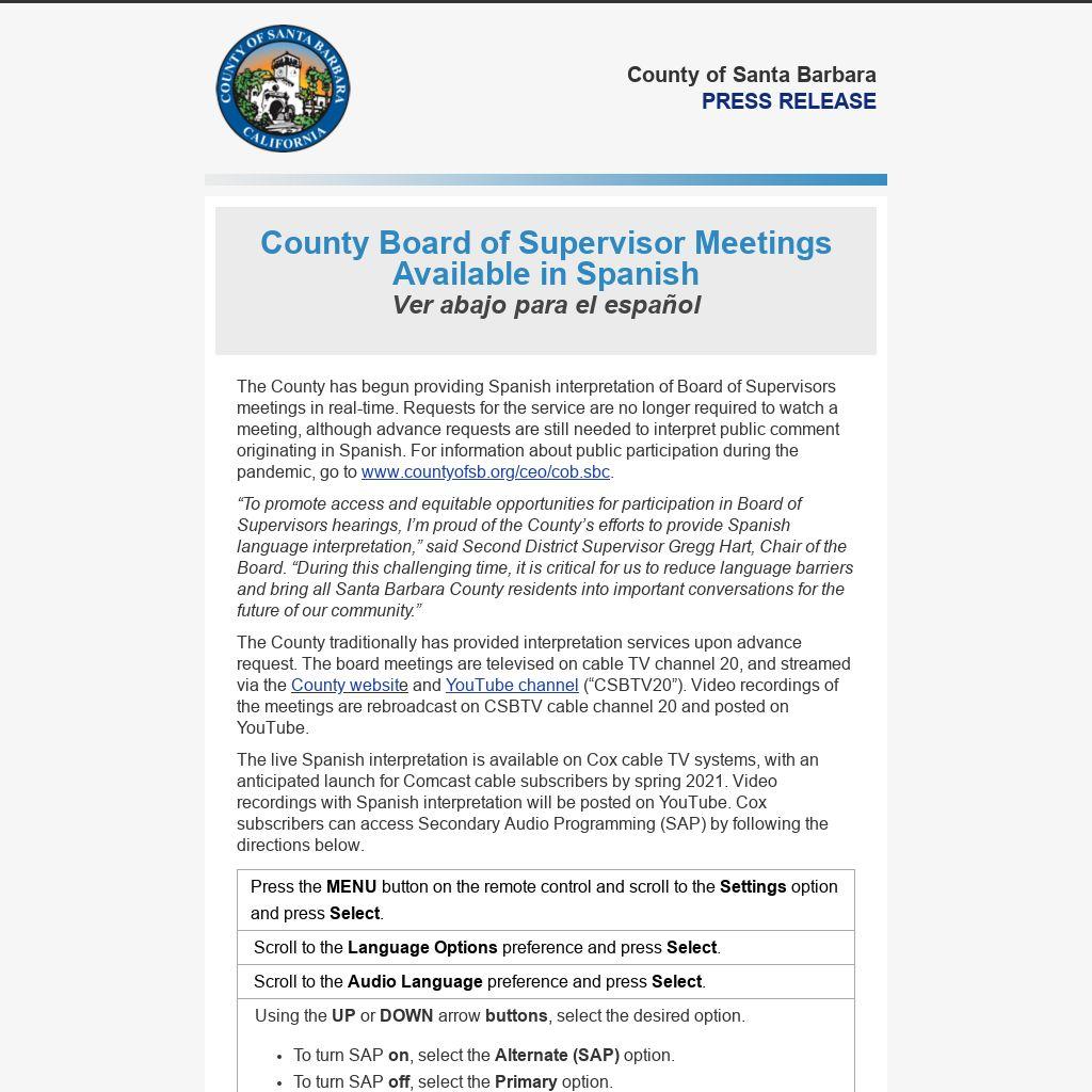 El Condado de Santa Bárbara ha comenzado a ofrecer interpretación en español de las reuniones de la Junta de Supervisores en tiempo real. Las solicitudes de servicio ya no tienen que hacerse para ver una reunión, a pesar de las solicitudes anticipadas siguen siendo necesarios para interpretar los comentarios del público originarios en español. Para obtener información sobre la participación pública durante la pandemia, visite countyofsb.org/ceo/cob.sbc.