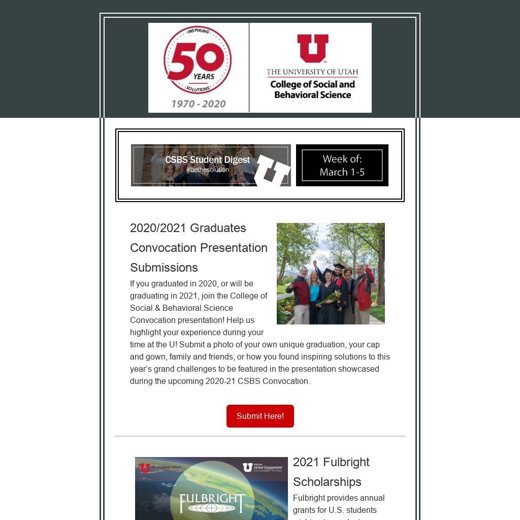 If you graduated in 2020, or will be graduating in 2021, join the College of Social & Behavioral Science Convocation presentation! Help us highlight your experience during your time at the U! Submit a photo of your own unique graduation, your cap and gown, family and friends, or how you found inspiring solutions to this year’s grand challenges to be featured in the presentation showcased during the upcoming 2020-21 CSBS Convocation.