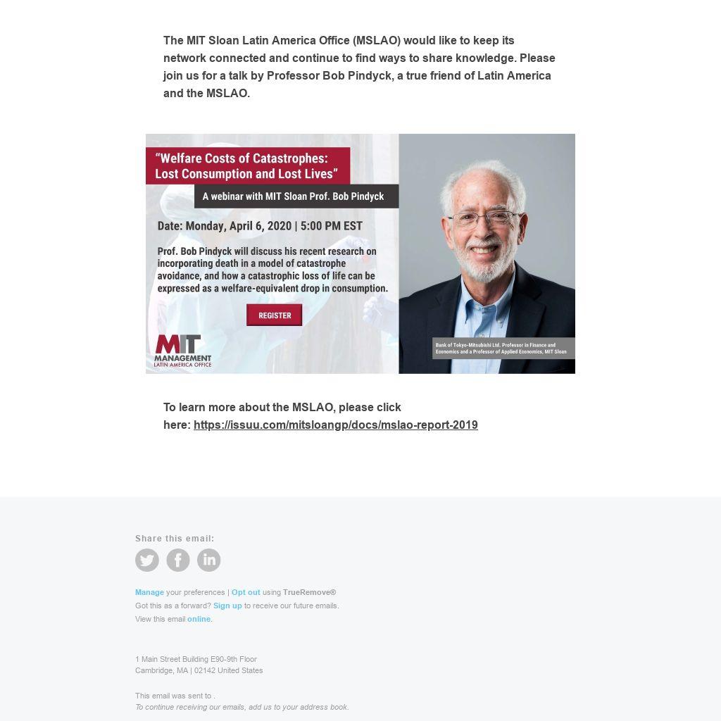 The MIT Sloan Latin America Office (MSLAO) would like to keep its network connected and continue to find ways to share knowledge. Please join us for a talk by Professor Bob Pindyck, a true friend of Latin America and the MSLAO.