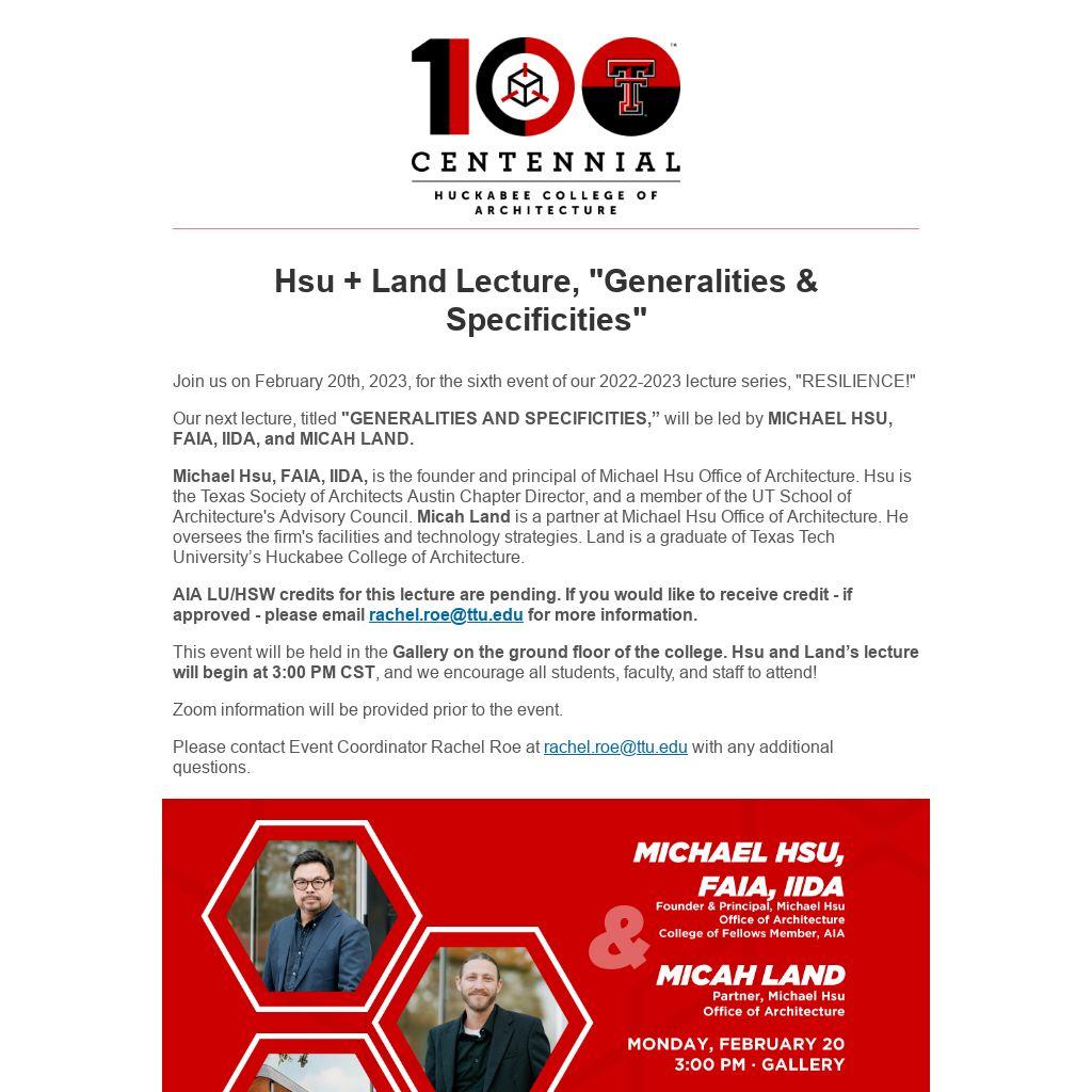 Our next lecture, titled "GENERALITIES AND SPECIFICITIES,” will be led by MICHAEL HSU, FAIA, IIDA, and MICAH LAND.