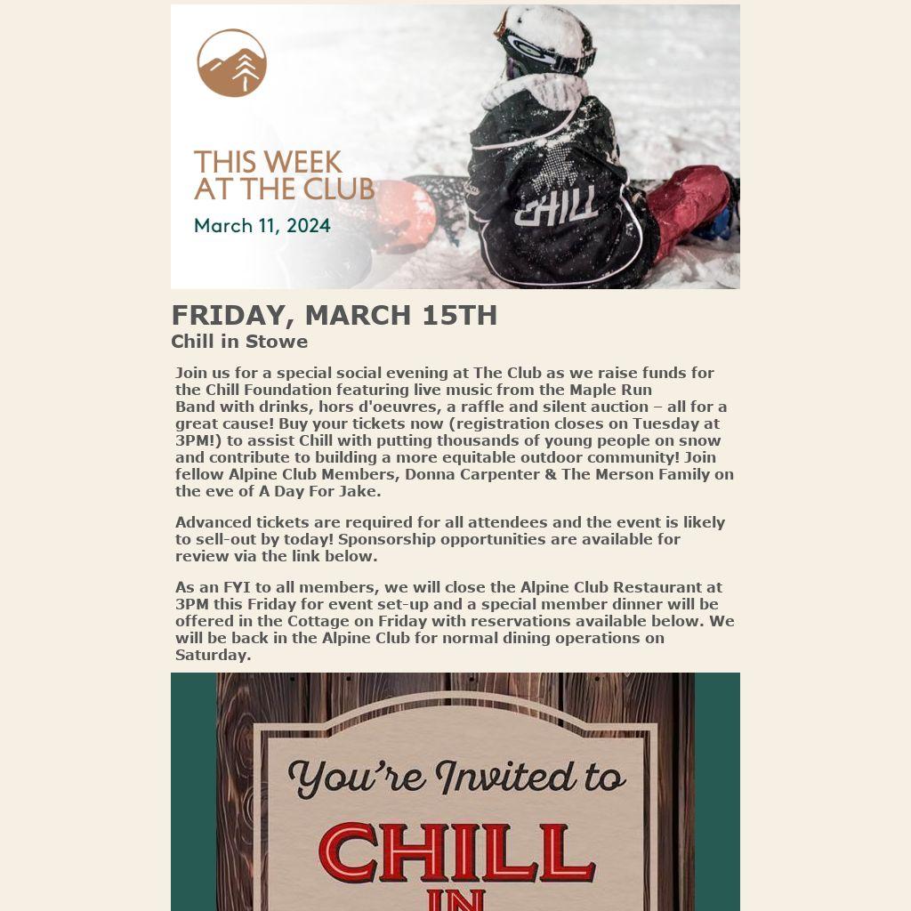 Join us for a special social evening at The Club as we raise funds for the Chill Foundation featuring live music from the Maple Run Band with drinks, hors d'oeuvres, a raffle and silent auction – all for a great cause! Buy your tickets now (registration closes on Tuesday at 3PM!) to assist Chill with putting thousands of young people on snow and contribute to building a more equitable outdoor community! Join fellow Alpine Club Members, Donna Carpenter & The Merson Family on the eve of A Day For Jake.