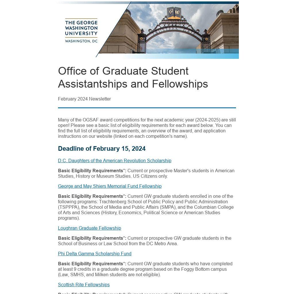 Basic Eligibility Requirements*: Current GW graduate students who have completed at least 9 credits in a graduate degree program based on the Foggy Bottom campus (Law, SMHS, and Milken students are not eligible).