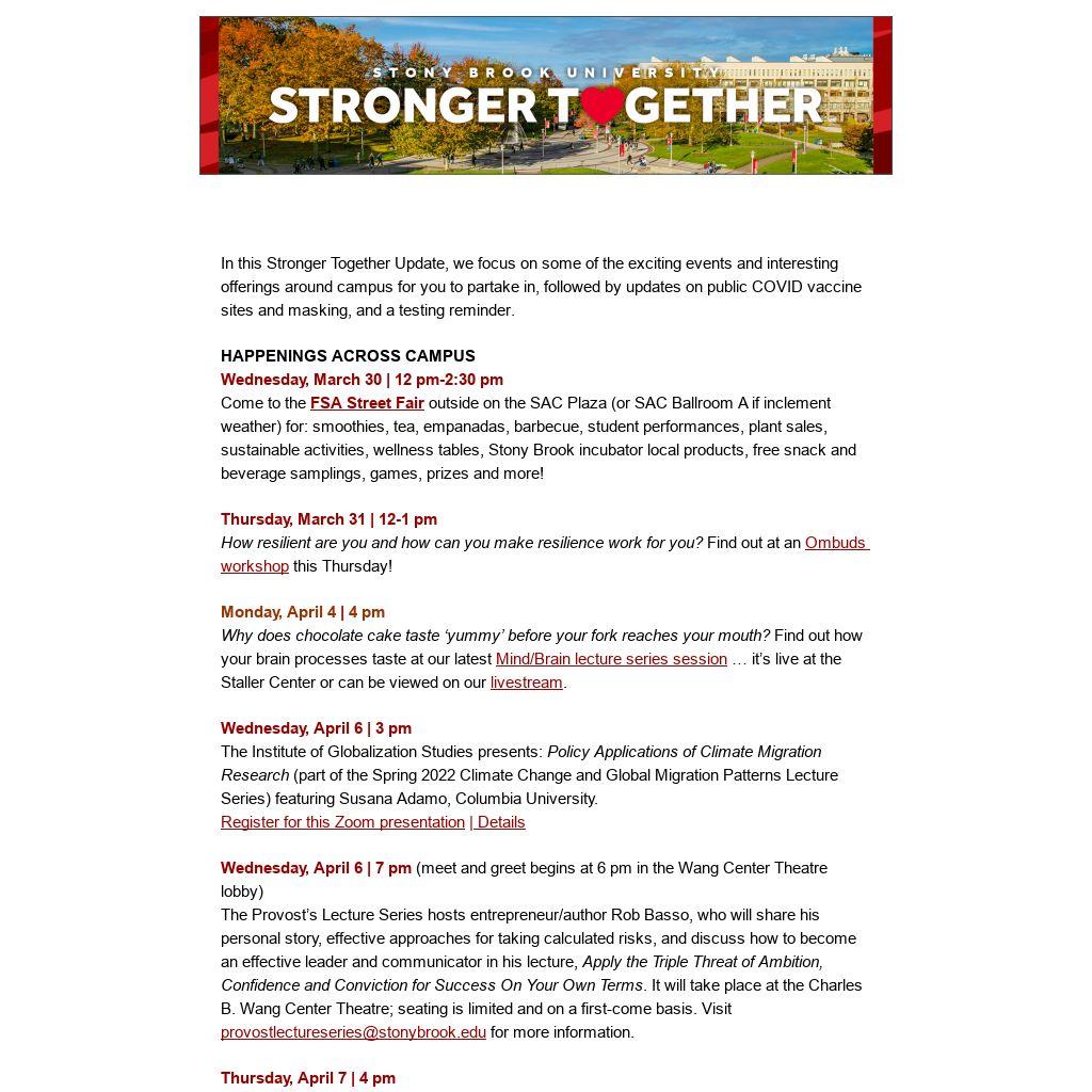 In this Stronger Together Update, we focus on some of the exciting events and interesting offerings around campus for you to partake in, followed by updates on public COVID vaccine sites and masking, and a testing reminder.
