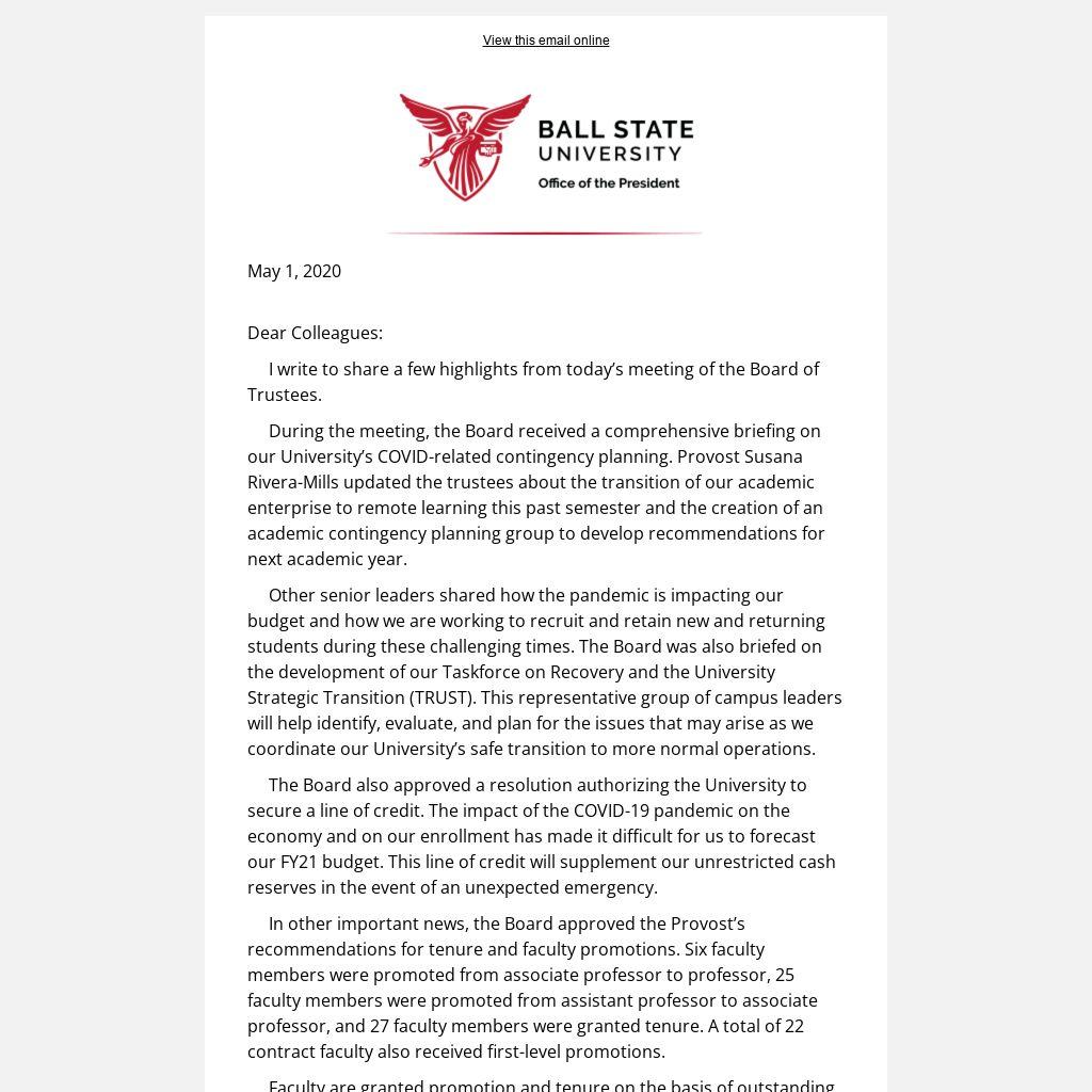 Other senior leaders shared how the pandemic is impacting our budget and how we are working to recruit and retain new and returning students during these challenging times. The Board was also briefed on the development of our Taskforce on Recovery and the University Strategic Transition (TRUST). This representative group of campus leaders will help identify, evaluate, and plan for the issues that may arise as we coordinate our University’s safe transition to more normal operations.