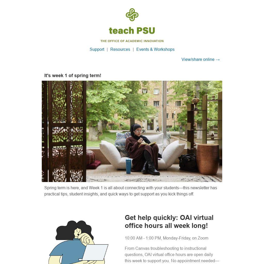 Spring term is here, and Week 1 is all about connecting with your students—this newsletter has practical tips, student insights, and quick ways to get support as you kick things off.