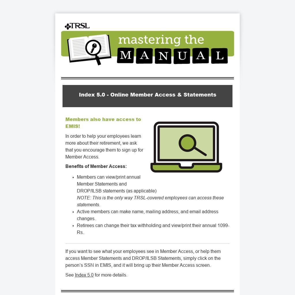 In order to help your employees learn more about their retirement, we ask that you encourage them to sign up for Member Access.