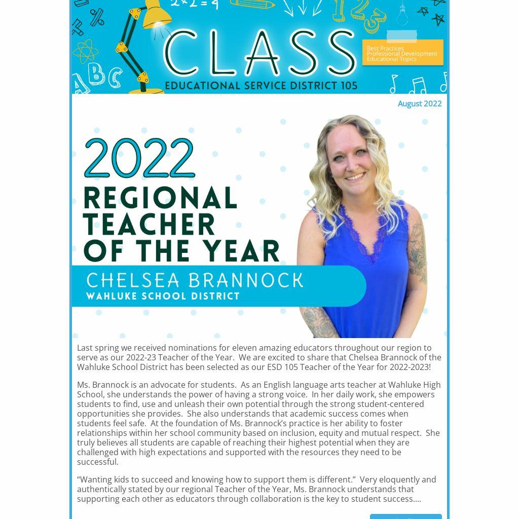 Last spring we received nominations for eleven amazing educators throughout our region to serve as our 2022-23 Teacher of the Year. We are excited to share that Chelsea Brannock of the Wahluke School District has been selected as our ESD 105 Teacher of the Year for 2022-2023!