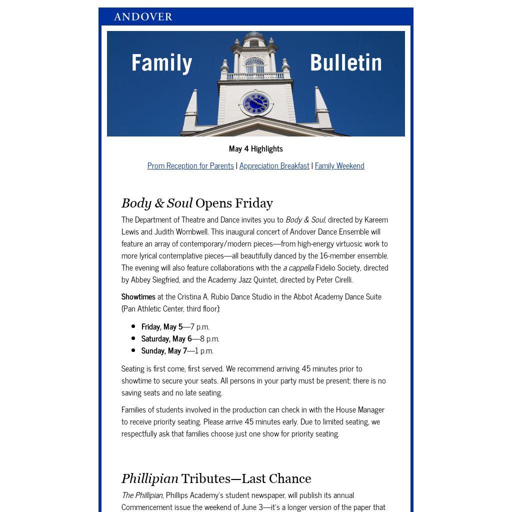 You received this message because you are a valued member of the Andover community. We are obligated to communicate with you, and require you to be on our email list while your student(s) attends Phillips Academy. For more information contact the Dean of Studies Office. |