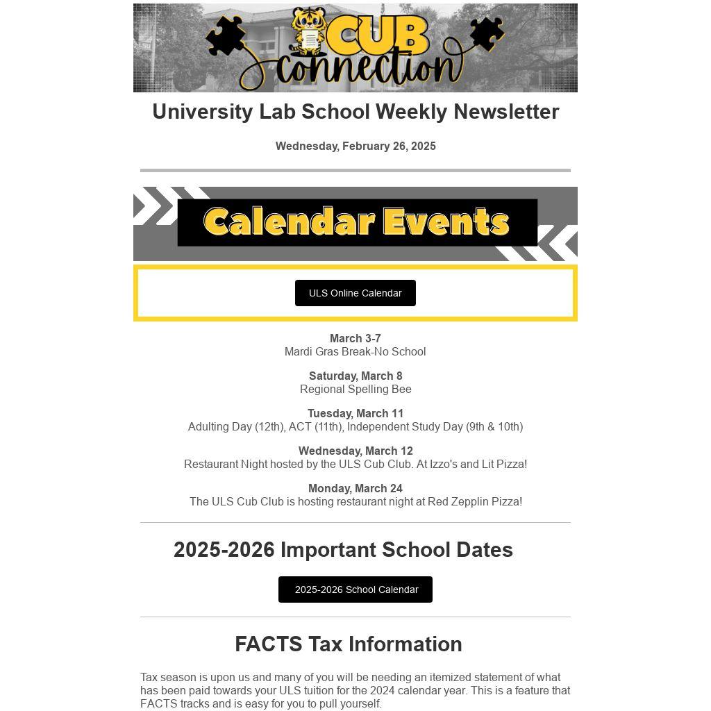 FACTS Service Agreements for the 2025-2026 school year will be distributed on Thursday, February 27, and must be completed by Friday, March 14. For all returning families, the $200 Student Activity Fee is due via FACTS by Monday, March 24. For inquiries, please email espitznagel@lsu.edu.