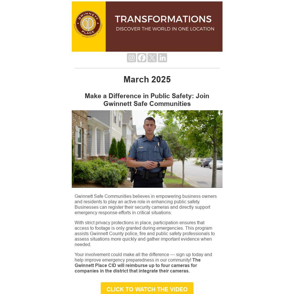 Your involvement could make all the difference — sign up today and help improve emergency preparedness in our community! The Gwinnett Place CID will reimburse up to four cameras for companies in the district that integrate their cameras.