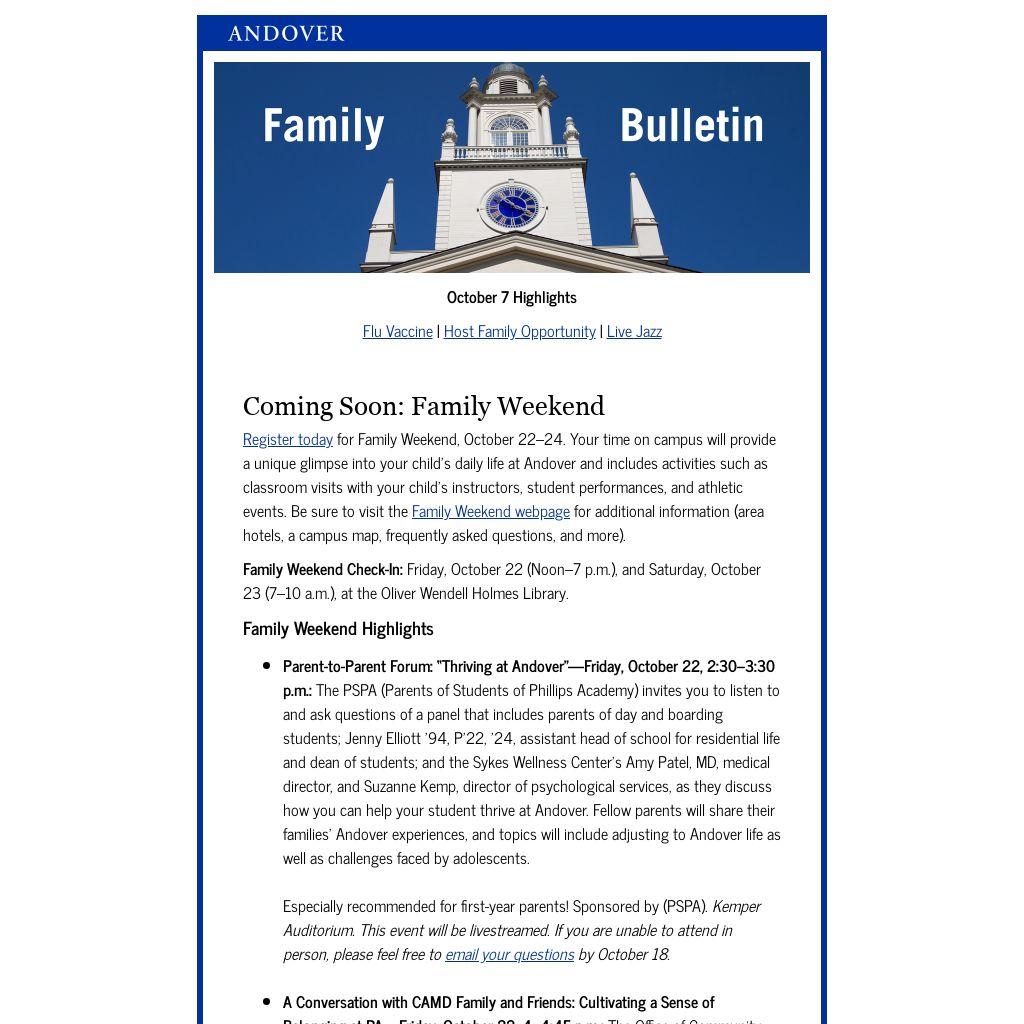 Please check the Events Calendar on Andover’s website regularly for additional in-person and online events that may be open to families. The Weekender, the Academy’s one-stop guide to weekend student activities, opportunities, club-organized events, guest speakers, performances, and athletic contests, is posted on The Hive.