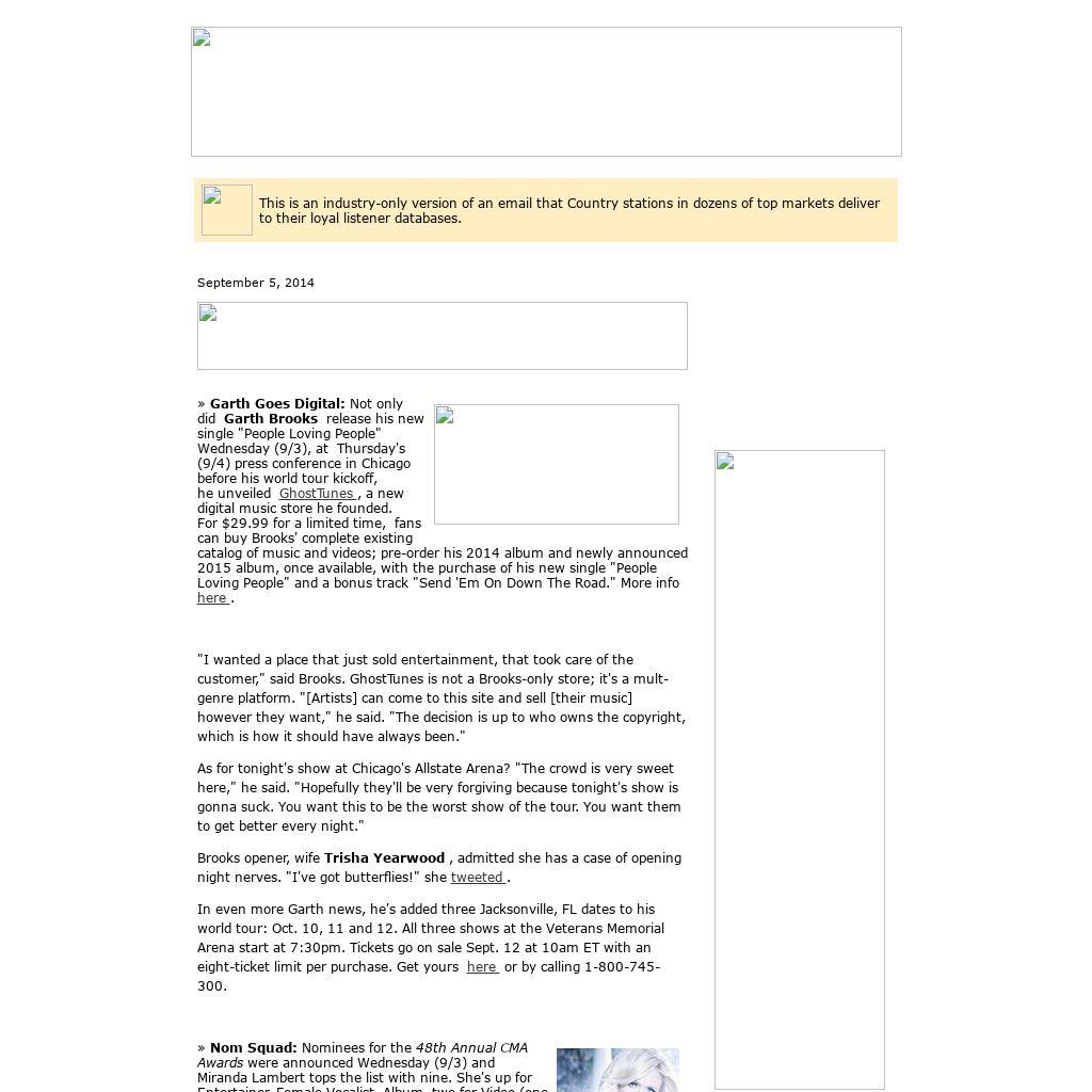 The CMA and the public television concert series Front and Center will present two hour-long concerts leading up to The 48th Annual CMA Awards . The first show airs Oct. 14 and features Dierks Bentley along with songwriters Jim Beavers , Ross Copperman , Brett James and Jon Randall . The second show airs Oct. 28 and features Lady Antebellum singing their hits and songs from their upcoming album 747 . Writers Rodney Clawson , Tom Douglas , Josh Kear , Luke Laird and Abe Stoklasa join them to share stories behind the songs. Birthdays Friday (9/5): Jamie Oldaker (The Tractors). Saturday (9/6): Mark Chesnutt, David Allan Coe, Buddy Miller, Joe Smyth (Sawyer Brown), Jeff Foxworthy, Sylvia Hutton, Michelle Poe, Mark Luna, the late Mel McDaniel. Sunday (9/7): Angela Kaset, the late Buddy Holly. Monday (9/8): the late Patsy Cline, the late Harlan Howard, the late Milton Brown, the late Jimmie Rodgers. On TV Monday (9/8): Blake Shelton, The Ellen DeGeneres Show (syndicated). Upcoming Album Releases Sept. 8 Alabama Angels Among Us: Hymns & Gospel Favorites Sep. 9 Lee Brice I Don't Dance Dustin Lynch Where It's At Brothers Osborne Self-Titled Sept. 16 Tim McGraw Sundown Heaven Town George Strait The Cowboy Rides Away: Live From AT&T Stadium Sept. 23 Kenny Chesney The Big Revival span> Lee Ann Womack The Way I'm Livin' Big & Rich Gravity Sept. 30 Lady Antebellum 747 Blake Shelton Bringing Back The Sunshine Marty Stuart Saturday Night & Sunday Morning Ricky Skaggs and Sharon White Hearts Like Ours Oct. 7 Jason Aldean Old Boots, New Dirt Old Dominion Self-Titled Oct. 14 Florida Georgia Line Anything Goes Oct. 21 Little Big Town Pain Killer Oct. 28 Stoney Larue Aviator Nov. 4 The Doobie Brothers Southbound |