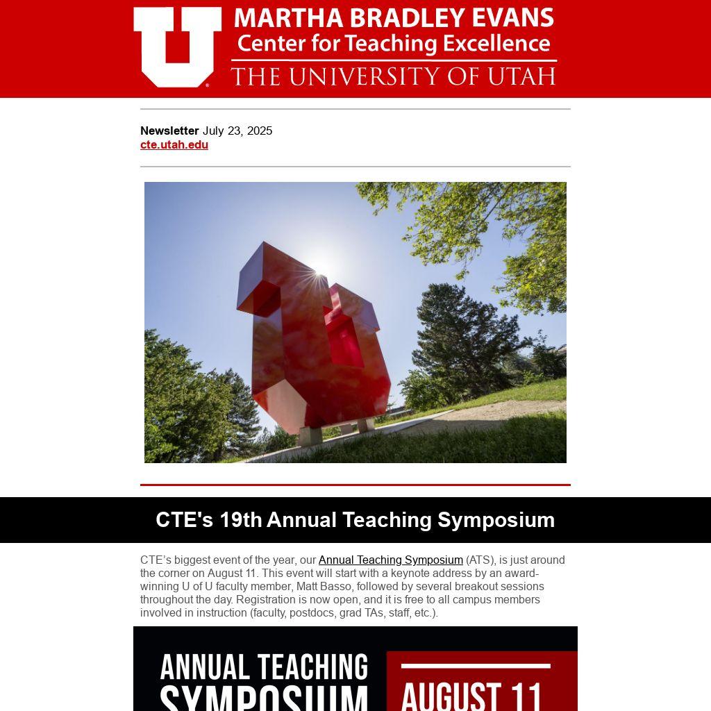 CTE’s biggest event of the year, our Annual Teaching Symposium (ATS), is just around the corner on August 11. This event will start with a keynote address by an award-winning U of U faculty member, Matt Basso, followed by several breakout sessions throughout the day. Registration is now open, and it is free to all campus members involved in instruction (faculty, postdocs, grad TAs, staff, etc.).