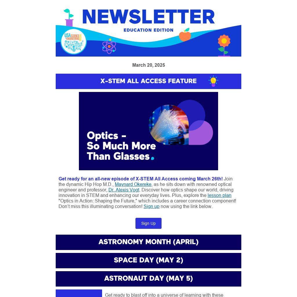 Get ready for an all-new episode of X-STEM All Access coming March 26th! Join the dynamic Hip Hop M.D., Maynard Okereke, as he sits down with renowned optical engineer and professor, Dr. Alexis Vogt. Discover how optics shape our world, driving innovation in STEM and enhancing our everyday lives. Plus, explore the lesson plan "Optics in Action: Shaping the Future," which includes a career connection component! Don’t miss this illuminating conversation! Sign up now using the link below.
