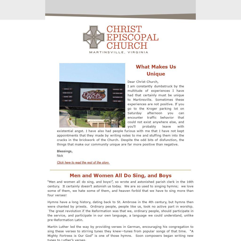 The first hymnal published in America was the Bay Psalm Book (1698), containing 13 of those 18 familiar tunes. The great Easter hymn “Jesus Christ is Risen Today” appeared in 1708. Our Hymnal 1982 contains many tunes from the Reformation and post Reformation, as well as many newly composed hymns. Singing together, participating in the service, and making a joyful noise to the Lord fills our souls and enriches our worship!