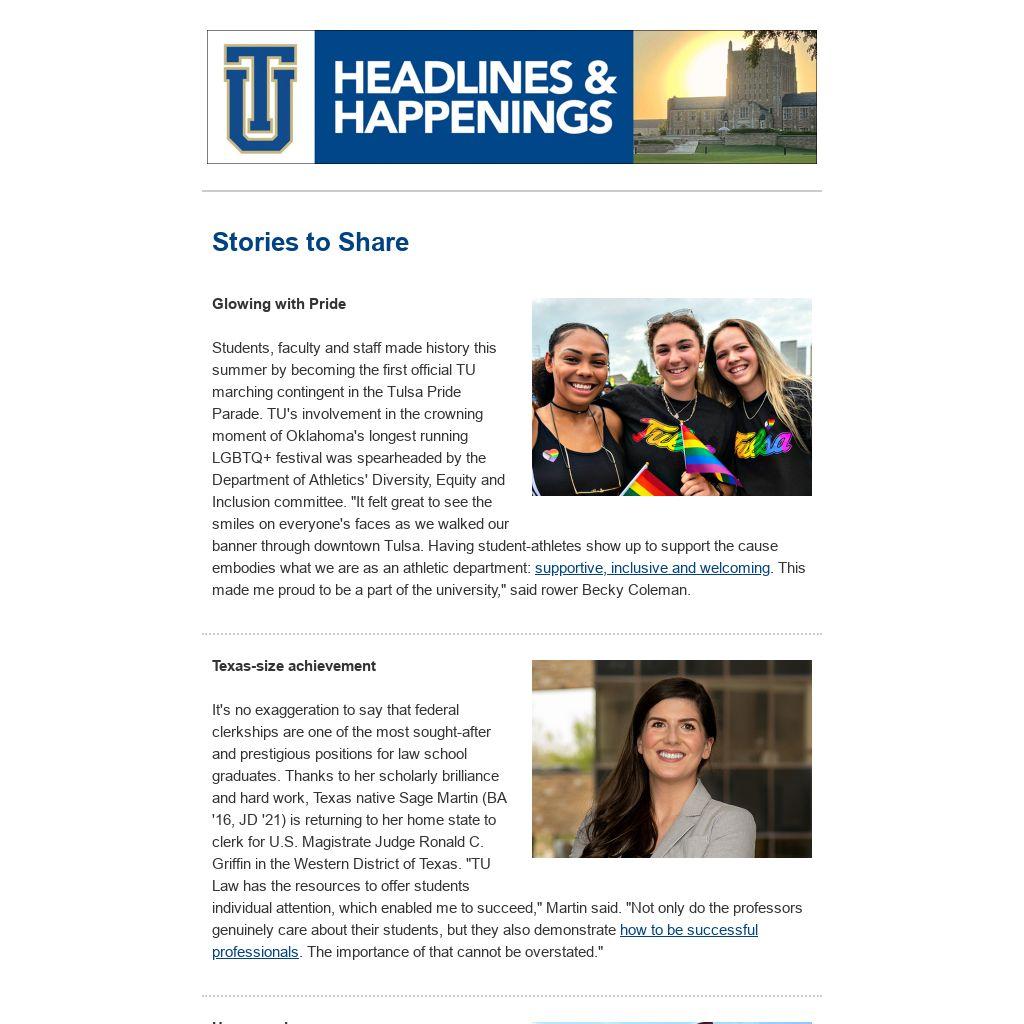 Students, faculty and staff made history this summer by becoming the first official TU marching contingent in the Tulsa Pride Parade. TU's involvement in the crowning moment of Oklahoma's longest running LGBTQ+ festival was spearheaded by the Department of Athletics' Diversity, Equity and Inclusion committee. "It felt great to see the smiles on everyone's faces as we walked our banner through downtown Tulsa. Having student-athletes show up to support the cause embodies what we are as an athletic department: supportive, inclusive and welcoming. This made me proud to be a part of the university," said rower Becky Coleman.