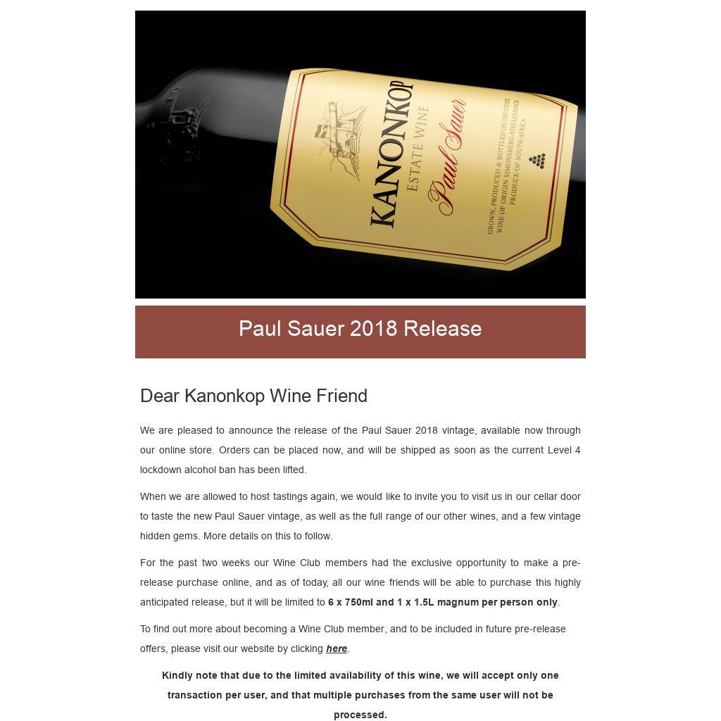 We are pleased to announce the release of the Paul Sauer 2018 vintage, available now through our online store. Orders can be placed now, and will be shipped as soon as the current Level 4 lockdown alcohol ban has been lifted.