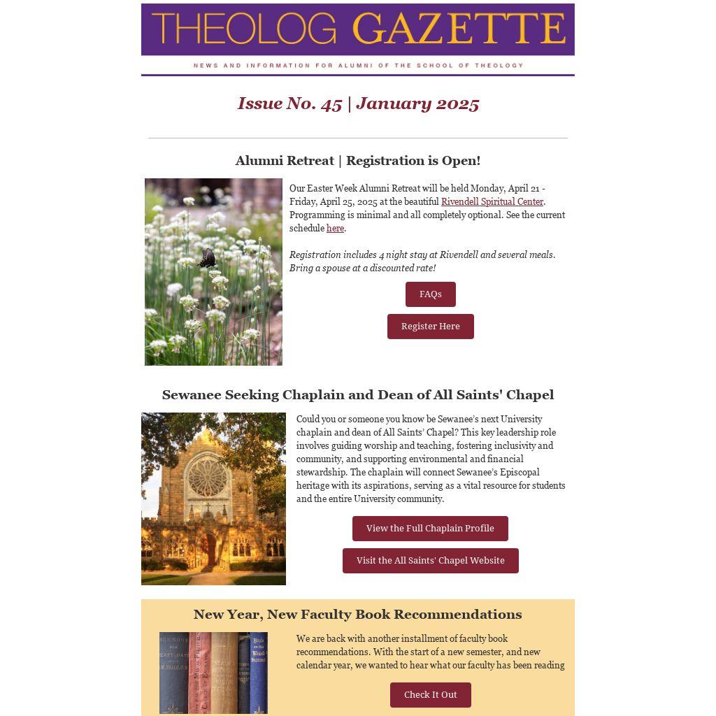 Our Easter Week Alumni Retreat will be held Monday, April 21 - Friday, April 25, 2025 at the beautiful Rivendell Spiritual Center. Programming is minimal and all completely optional. See the current schedule here.