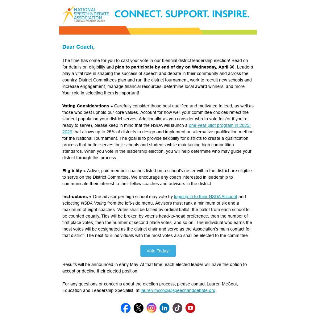 The time has come for you to cast your vote in our biennial district leadership election! Read on for details on eligibility and plan to participate by end of day on Wednesday, April 30. Leaders play a vital role in shaping the success of speech and debate in their community and across the country. District Committees plan and run the district tournament, work to recruit new schools and increase engagement, manage financial resources, determine local award winners, and more. Your role in selecting them is important!