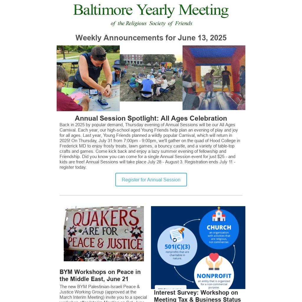 Back in 2025 by popular demand, Thursday evening of Annual Sessions will be our All Ages Carnival. Each year, our high-school aged Young Friends help plan an evening of play and joy for all ages. Last year, Young Friends planned a wildly popular Carnival, which will return in 2025! On Thursday, July 31 from 7:00pm - 9:00pm, we'll gather on the quad of Hood College in Frederick MD to enjoy frosty treats, lawn games, a bouncy castle, and a variety of table-top crafts and games. Come kick back and enjoy a lazy summer evening of fellowship and Friendship. Did you know you can come for a single Annual Session event for just $25 - and kids are free! Annual Sessions will take place July 28 - August 3. Registration ends July 11 - register today.