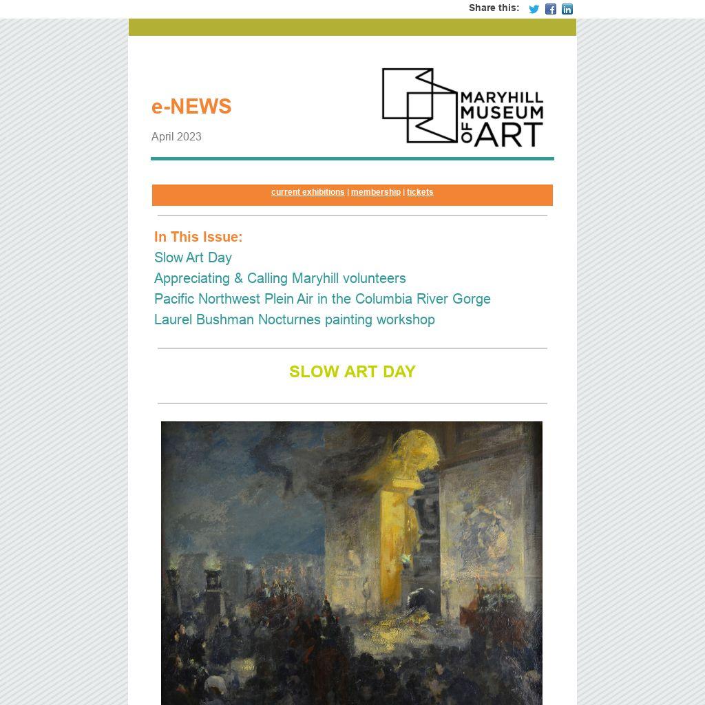 Images top to bottom: 1. Alfred Philippe Roll (French, 1846–1919), The Funeral of Victor Hugo, 1885, oil on canvas, 27” x 33”; Gift of Alma de Bretteville Spreckels, Collection of Maryhill Museum of Art, 1951.7.249. 2 - 4 : Images of Maryhill's grounds & gardens (photos: Miriam Sluis) 5: Lynn Mehta (Alexandria, VA), Biggs Junction, 2022, oil on canvas, 12” x 16”; Museum purchase, Collection of Maryhill Museum of Art, 22.8.2. 6. Laurel Bushman (San Francisco, CA), Carina. acrylic, 20" x 20" x .0.75"; Private collection. 7. Eugène Guioché (French, active 1897–1915), Plaster cast (Loïe Fuller’s hand), c. 1909, plaster, approx.. 11” tall; Gift of Loïe Fuller, Collection of Maryhill Museum of Art, 1941.7.1.