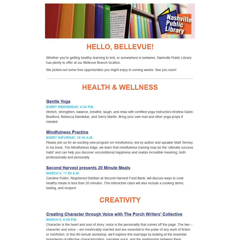 | HELLO, BELLEVUE! Whether you're getting healthy, learning to knit, or somewhere in between, Nashville Public Library has plenty to offer at our Bellevue Branch location. We picked out some free opportunities you might enjoy in coming weeks. See you soon!