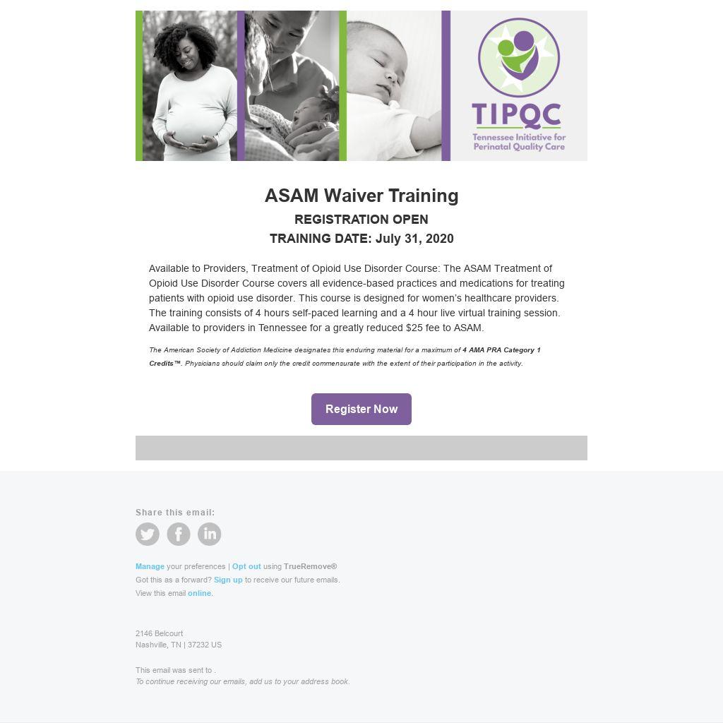 Available to Providers, Treatment of Opioid Use Disorder Course: The ASAM Treatment of Opioid Use Disorder Course covers all evidence-based practices and medications for treating patients with opioid use disorder. This course is designed for women’s healthcare providers. The training consists of 4 hours self-paced learning and a 4 hour live virtual training session. Available to providers in Tennessee for a greatly reduced $25 fee to ASAM.