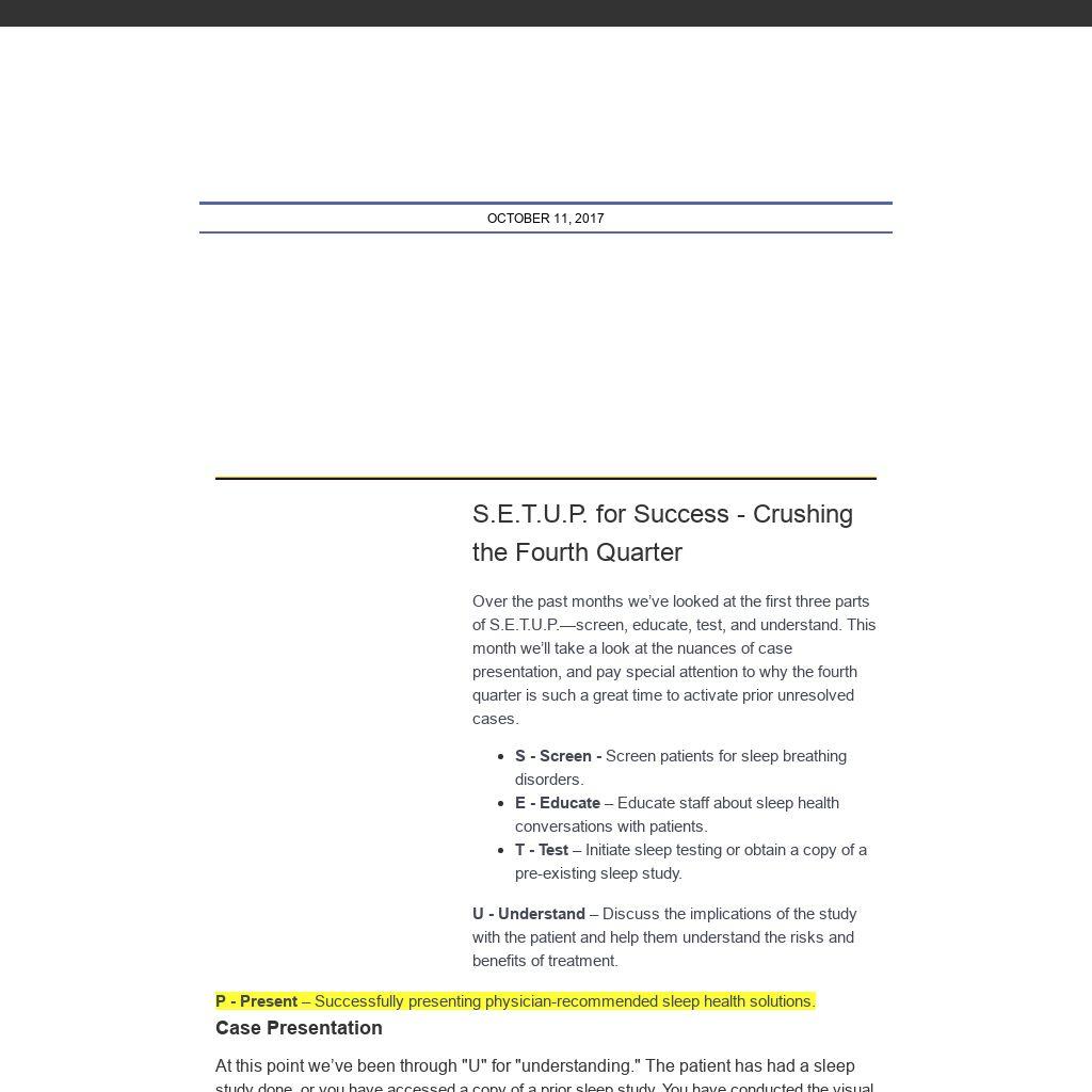 S.E.T.U.P. for Success - Crushing the Fourth QuarterOver the past months we’ve looked at the first three parts of S.E.T.U.P.—screen, educate, test, and understand. This month we’ll take a look at the nuances of case presentation, and pay special attention to why the fourth quarter is such a great time to activate prior unresolved cases.- S - Screen - Screen patients for sleep breathing disorders.