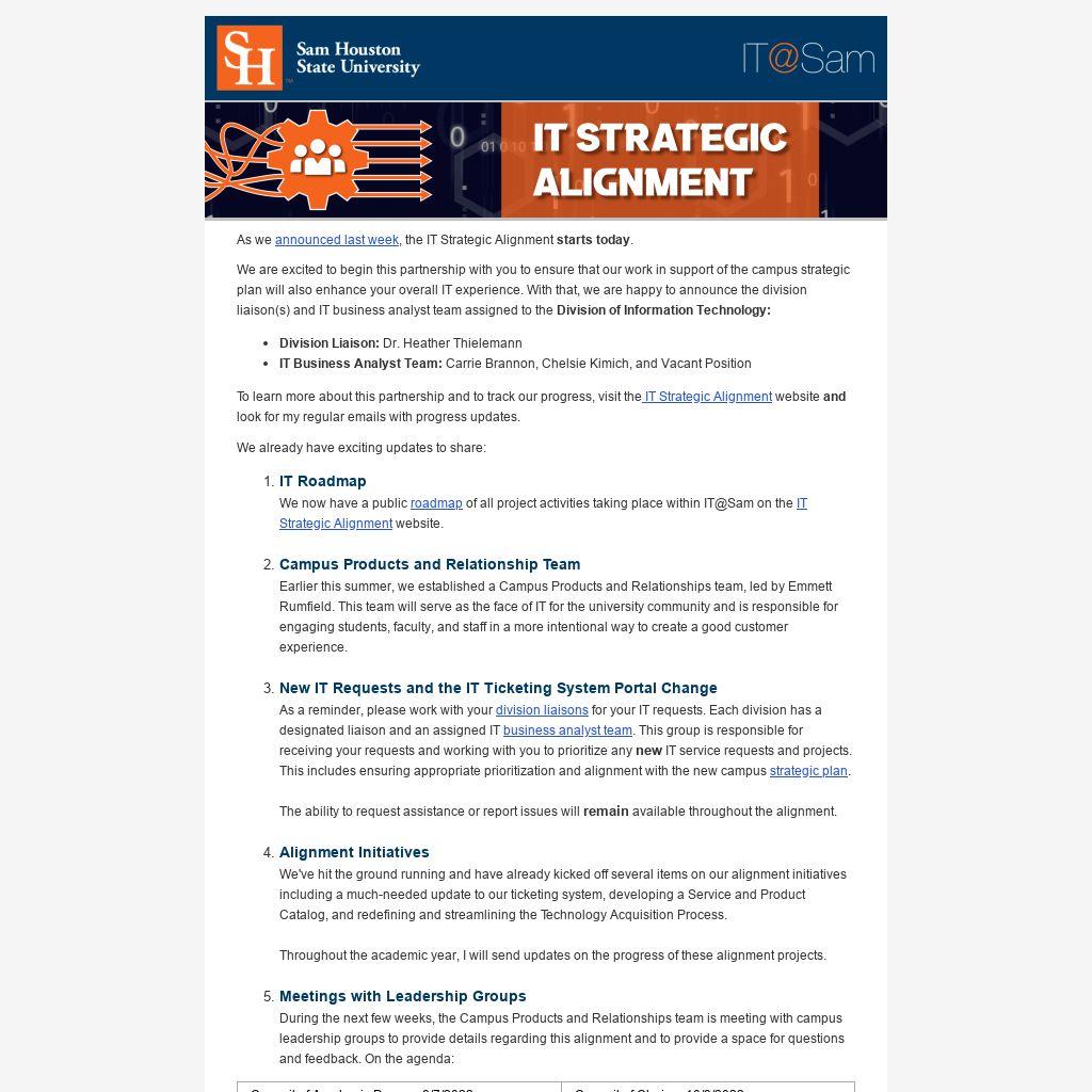 To learn more about this partnership and to track our progress, visit the IT Strategic Alignment website and look for my regular emails with progress updates.