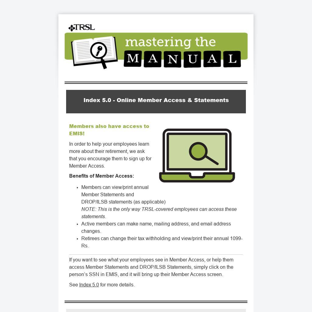 In order to help your employees learn more about their retirement, we ask that you encourage them to sign up for Member Access.