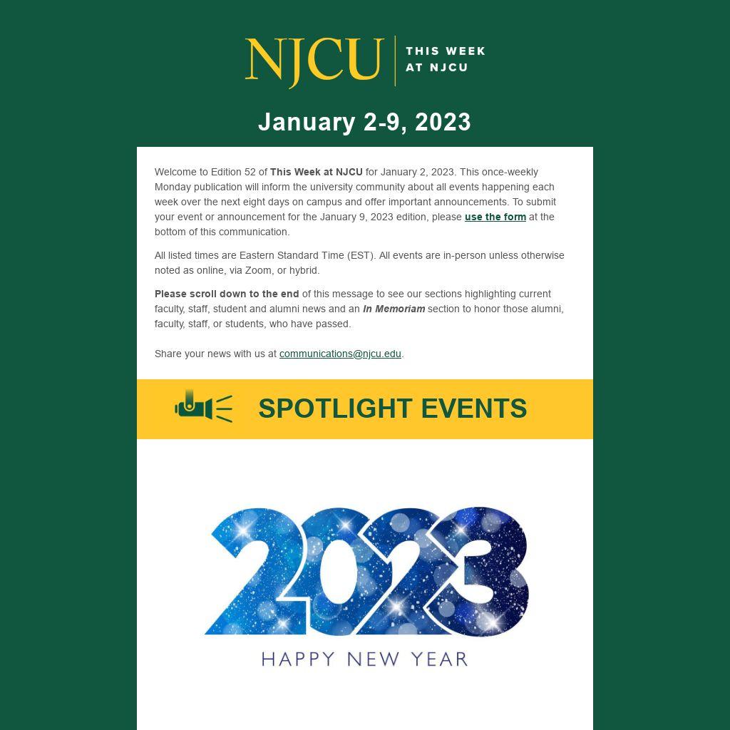 Welcome to Edition 52 of This Week at NJCU for January 2, 2023. This once-weekly Monday publication will inform the university community about all events happening each week over the next eight days on campus and offer important announcements. To submit your event or announcement for the January 9, 2023 edition, please use the form at the bottom of this communication.