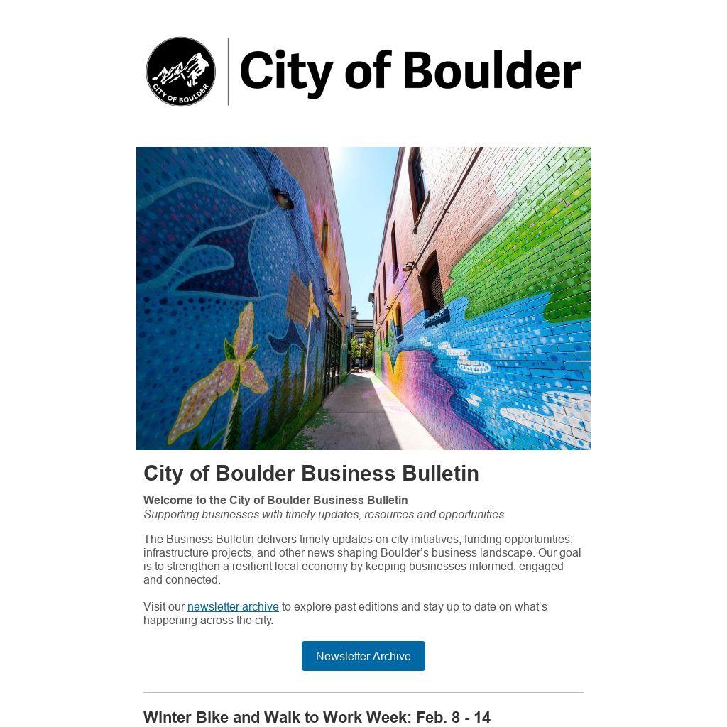 The Business Bulletin delivers timely updates on city initiatives, funding opportunities, infrastructure projects, and other news shaping Boulder’s business landscape. Our goal is to strengthen a resilient local economy by keeping businesses informed, engaged and connected.