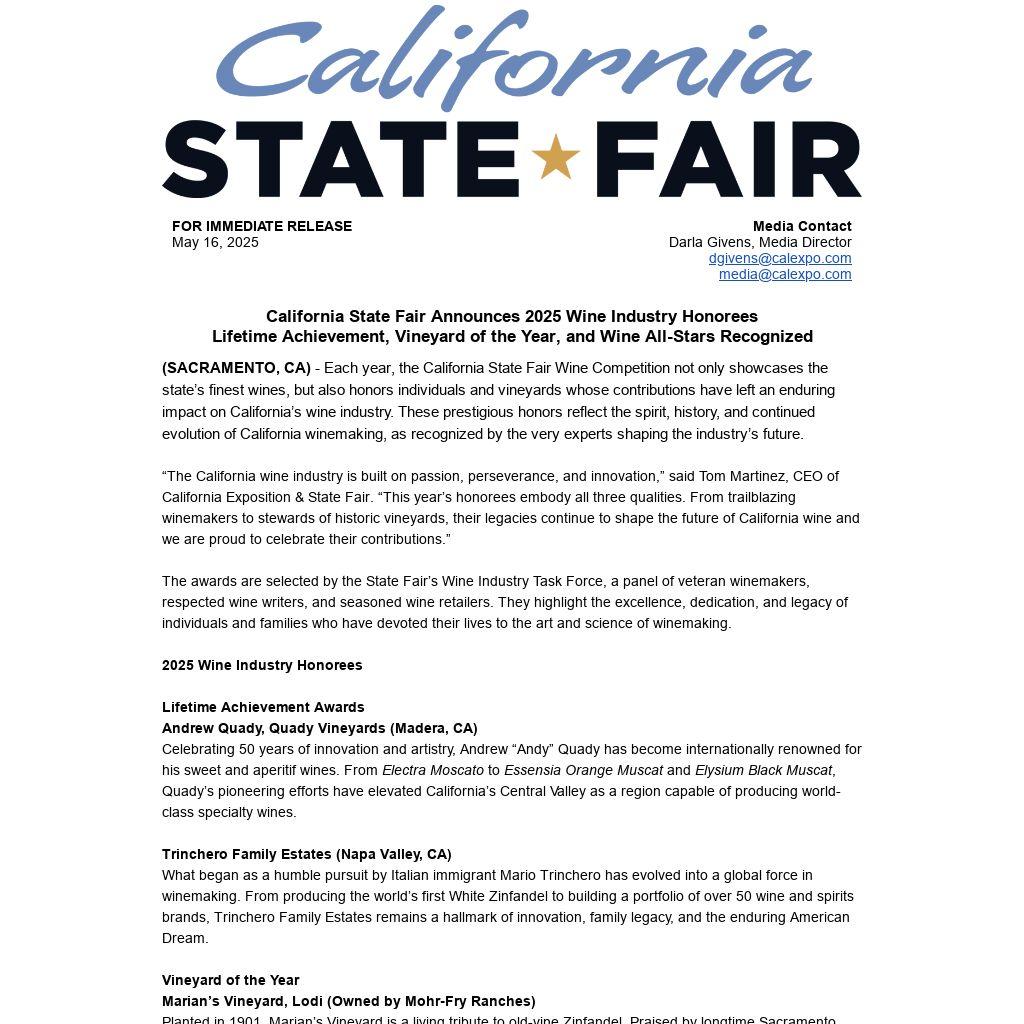 “The California wine industry is built on passion, perseverance, and innovation,” said Tom Martinez, CEO of California Exposition & State Fair. “This year’s honorees embody all three qualities. From trailblazing winemakers to stewards of historic vineyards, their legacies continue to shape the future of California wine and we are proud to celebrate their contributions.”