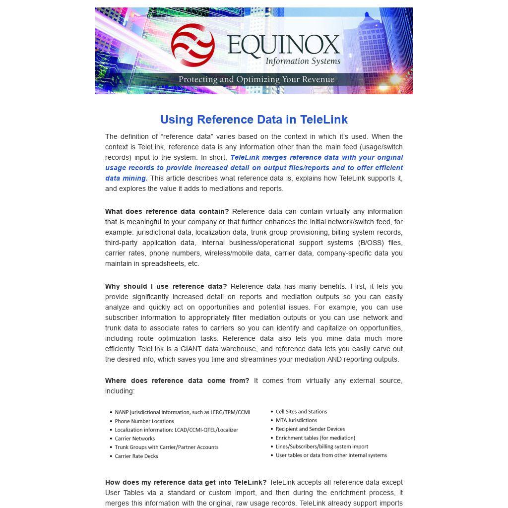 What does reference data contain? Reference data can contain virtually any information that is meaningful to your company or that further enhances the initial network/switch feed, for example: jurisdictional data, localization data, trunk group provisioning, billing system records, third-party application data, internal business/operational support systems (B/OSS) files, carrier rates, phone numbers, wireless/mobile data, carrier data, company-specific data you maintain in spreadsheets, etc.