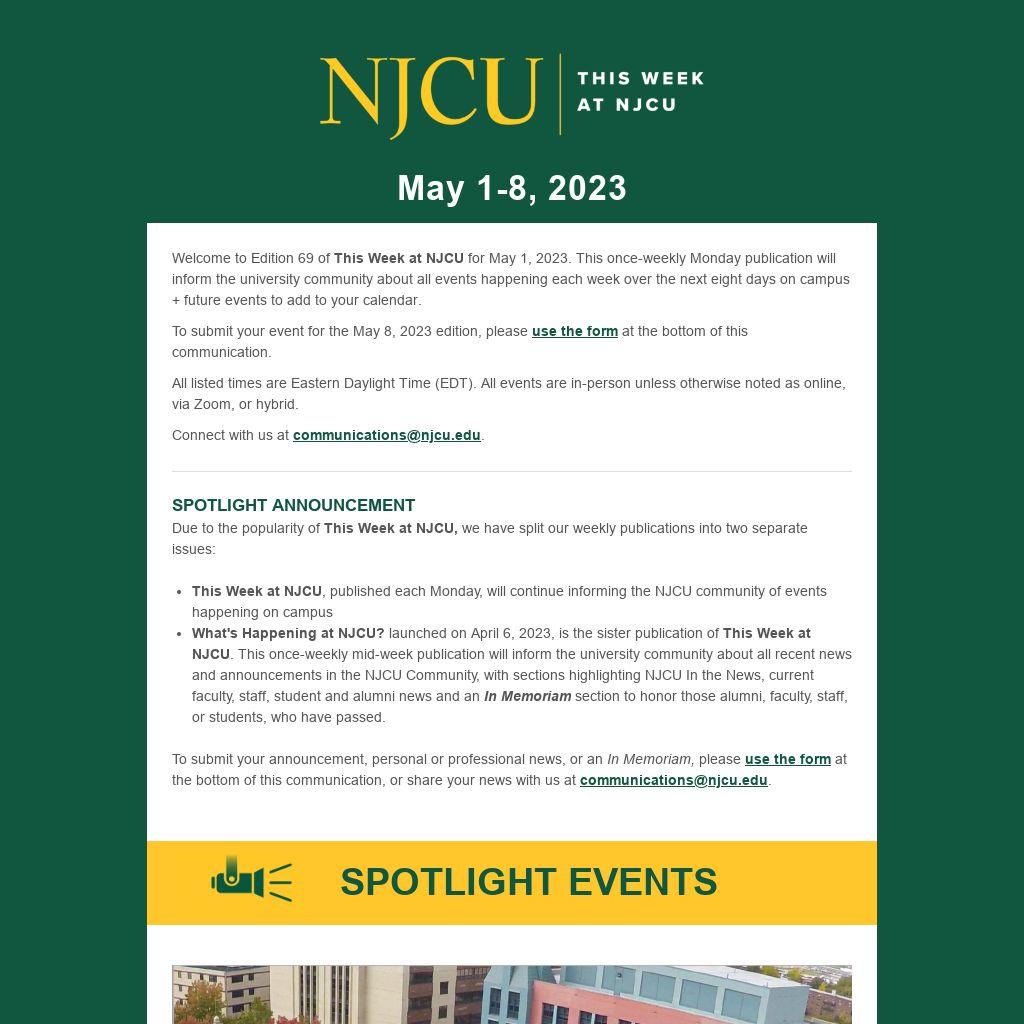 - This Week at NJCU, published each Monday, will continue informing the NJCU community of events happening on campus
