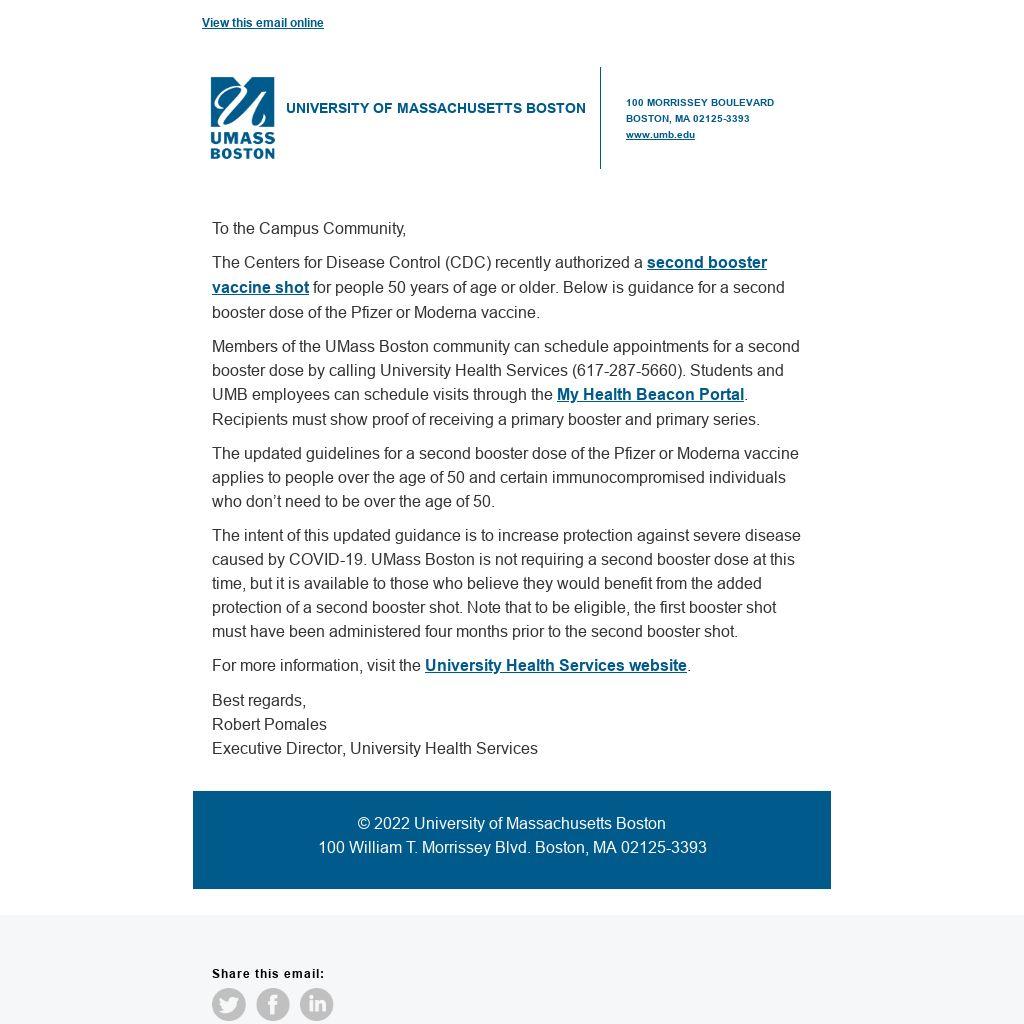 The intent of this updated guidance is to increase protection against severe disease caused by COVID-19. UMass Boston is not requiring a second booster dose at this time, but it is available to those who believe they would benefit from the added protection of a second booster shot. Note that to be eligible, the first booster shot must have been administered four months prior to the second booster shot.